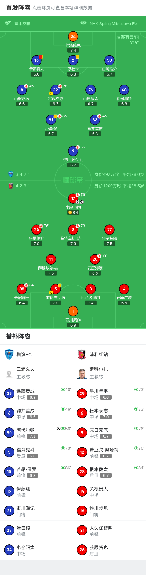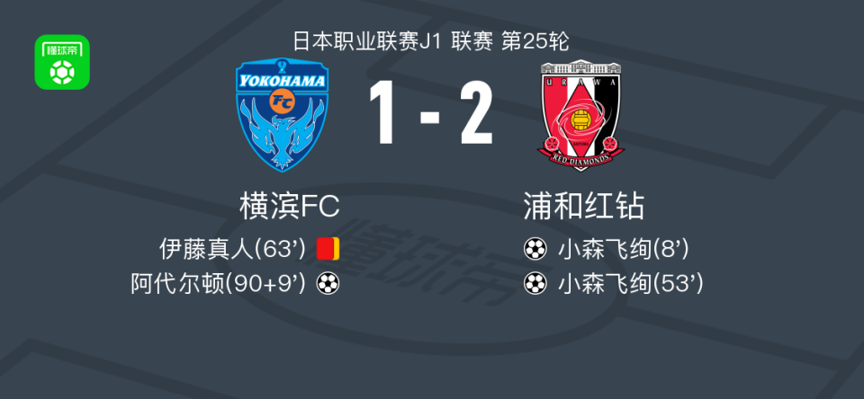 北京时间8月9日,日本职业联赛J1第25轮,横滨FC坐镇主场迎战浦和红钻。比赛开局阶段,浦和红钻球员小森飞绚在第8分钟为球队首开纪录。下半场开始后,小森飞绚在第53分钟再下一城,完成梅开二度。第63分钟,横滨FC球员伊藤真人因累计两张黄牌被红牌罚下,球队陷入人数劣势。进入下半场补时阶段,横滨FC由阿代尔顿在第9分钟扳回一球。最终,全场比赛结束,横滨FC以1比2不敌浦和红钻。